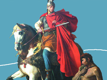 À Amiens, encore catéchumène, il donne la moitié de son manteau à un pauvre (l’autre moitié appartient à l’armée). Il a un songe: le pauvre est Jésus.