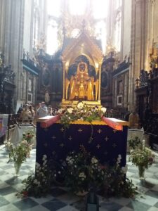– des temps forts, messe à la grotte, messe internationale, procession aux flambeaux.